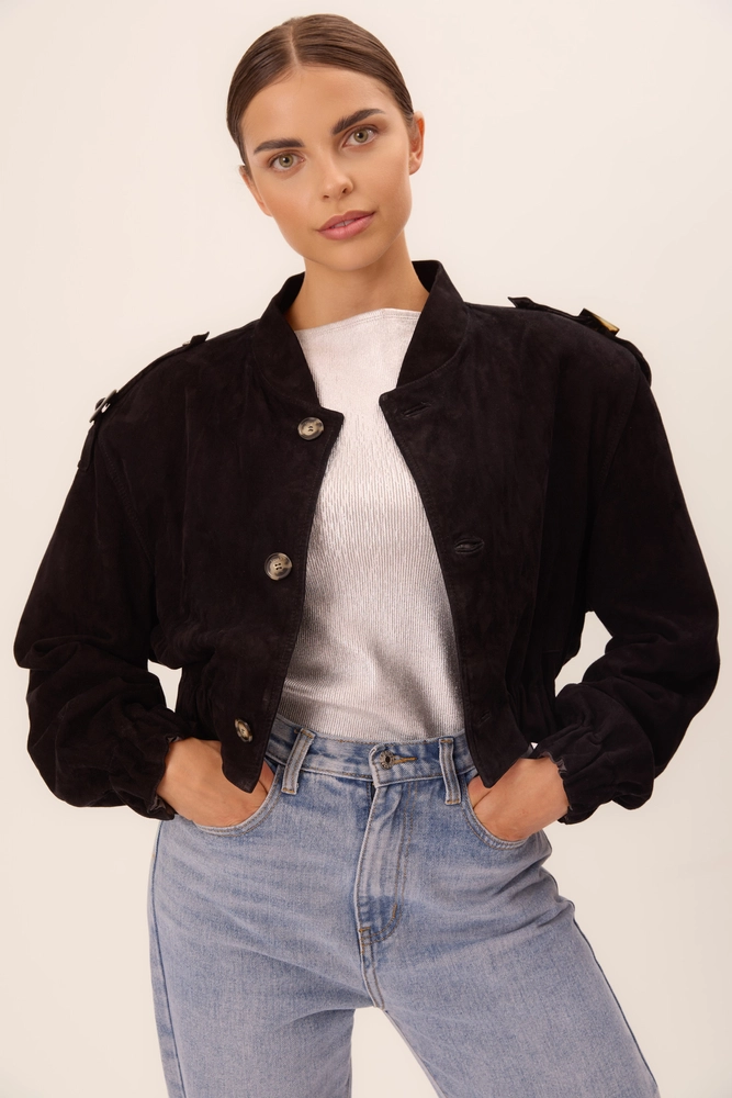 BLACK VELVET SHORT BOMBER JACKET WITH SHOULDER ELEMENTS