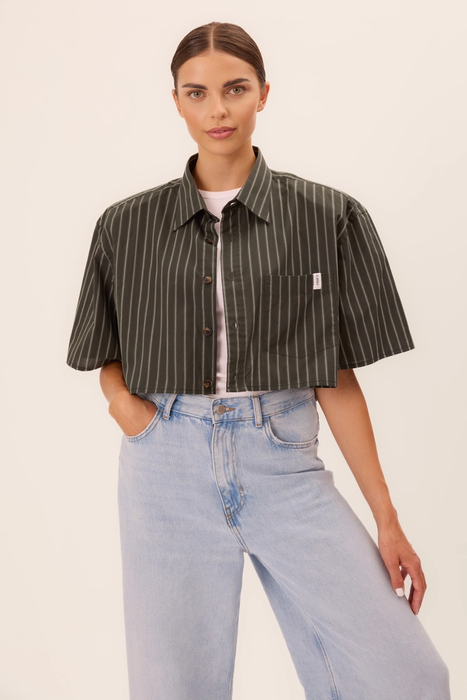 DARK GREEN STRIPED SHORT SHIRT WITH DETACHABLE SHOULDER PADS