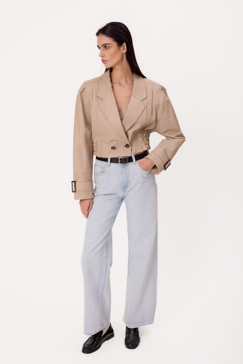 BEIGE ADJUSTABLE WAIST PETITE LEATHER JACKET WITH BUCKLES