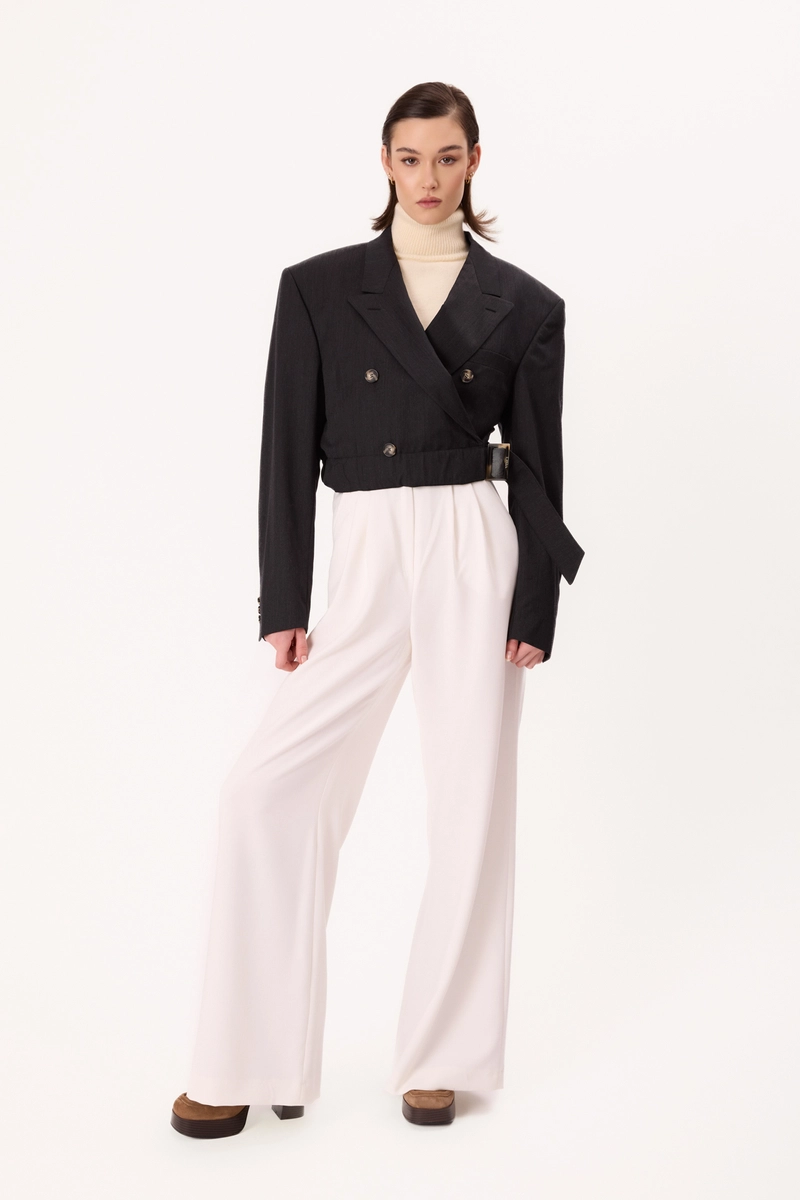 The classic VINNCI blazer is an upcycled design created from a men’s double-breasted jacket. Transformed into a shorter silhouette, it combines timeless tailoring with a modern cut. Fitted at the waist, with broad shoulders and logo buttons – a unique, versatile piece made with style and conscious fashion in mind.