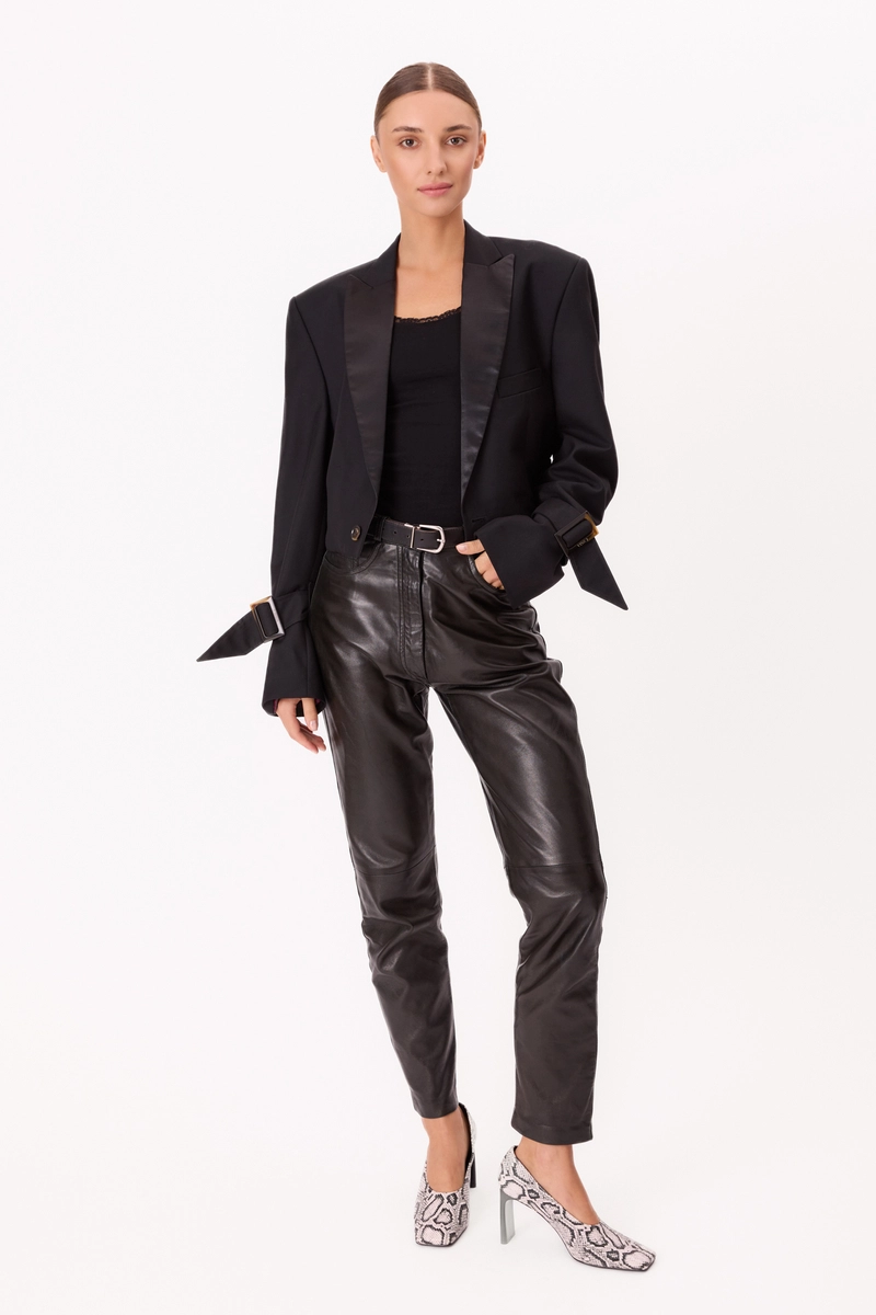 The black tuxedo-style VINNCI blazer is an upcycled design created from a men's blazer. Transformed into a shorter style, it combines classic form with a modern cut. Tapered at the waist, with wide shoulders, five rows of adjustable elastic, satin lapels, branded buttons, and sleeve buckles – timeless and unique, created with style and conscious fashion in mind.