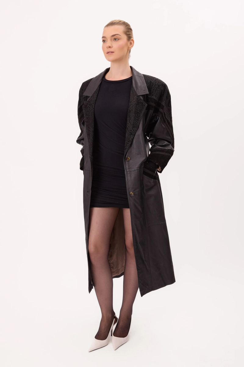 BLACK LEATHER FITTED COAT WITH DECORATIVE VELVET INSERTS
