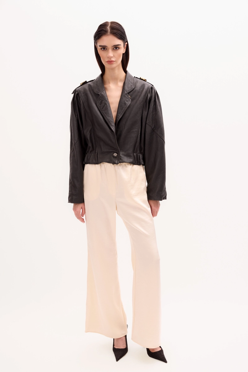 This black VINNCI leather jacket is a true second-hand gem – restored and reworked with meticulous attention to detail to ensure it will last for seasons to come. Its shorter design, with a wide elastic waistband and epaulets, combines classic form with a modern touch. Logo buttons and precise finishing accentuate the craftsmanship. Unique and stylish, it's a timeless wardrobe staple created with style and fashion in mind.