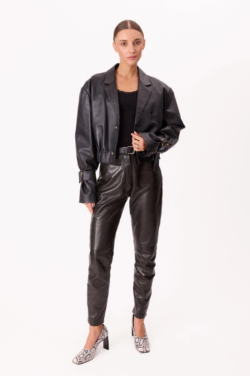 The black VINNCI biker jacket is a true second-hand gem – restored and reworked with meticulous attention to detail to last for many more seasons. Unique and stylish, it blends a classic silhouette with a modern edge. The short cut with a wide elastic waistband, defined shoulders, and buckle details on the sleeves accentuates the figure and adds boldness. Finished with branded buttons and precise craftsmanship, it’s a timeless and exceptional piece for any wardrobe.