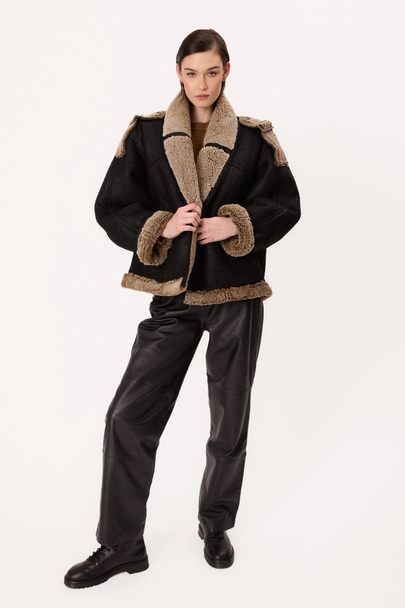 This black, natural VINNCI sheepskin coat is a true gem from the second-hand market – restored and reworked with exceptional attention to detail, ensuring it will last for seasons to come. The shorter cut, with wide shoulders and epaulets, combines classic elegance with a modern character. The zipper closure and precise finishing accentuate the craftsmanship. Unique, timeless, and designed with style and fashion in mind.