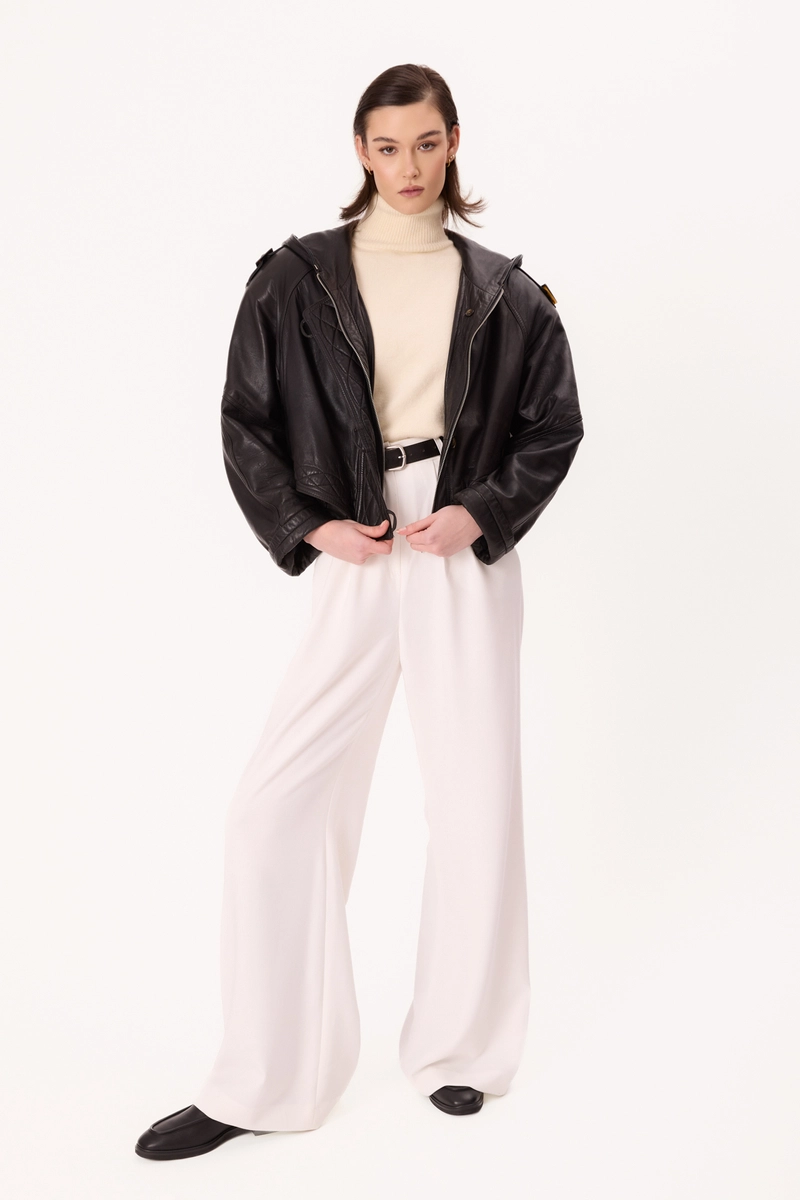 The black VINNCI leather jacket is a true second-hand gem — restored and reworked with great attention to detail to serve for many more seasons. The mid-length design with five adjustable elastic bands, a hood, and shoulder epaulettes combines classic style with a modern edge. A zip fastening, logo buttons, and refined finishes highlight the craftsmanship of the piece. Unique and stylish, it’s a timeless wardrobe essential created with style and conscious fashion in mind.