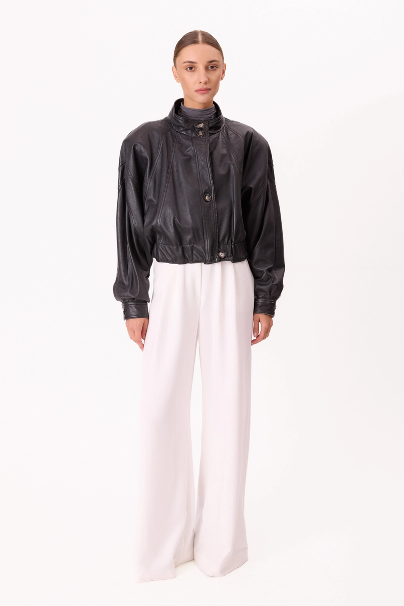 This black VINNCI leather jacket is a true second-hand gem – restored and reworked with meticulous attention to detail, ensuring it will last for seasons to come. Its shorter design, with a wide elastic waistband and epaulets, combines classic form with a modern touch. Logo buttons and precise finishing accentuate the craftsmanship. Unique and stylish, it's a timeless wardrobe staple created with style and fashion in mind.