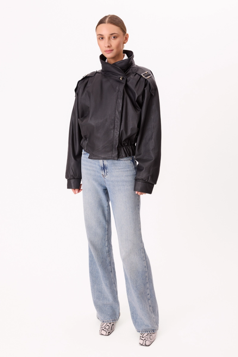 BLACK OVERSIZE LEATHER JACKET WITH HIGH COLLAR