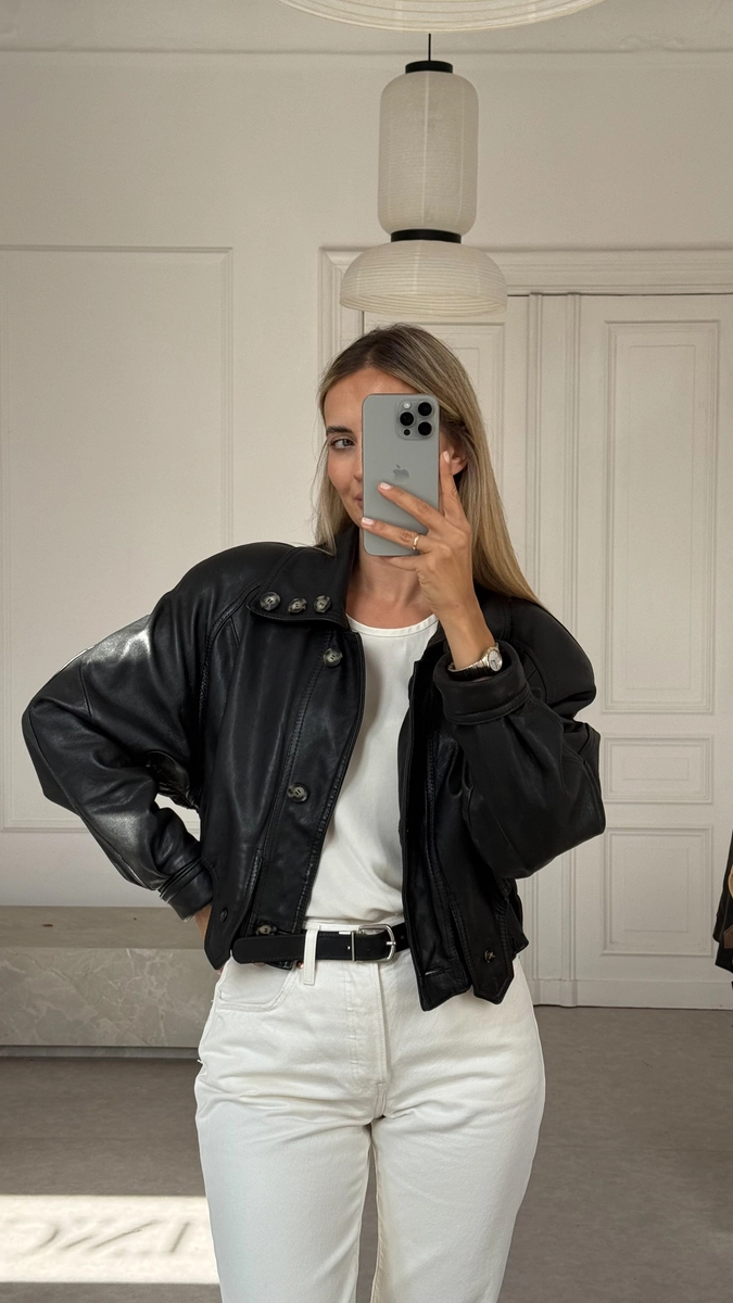 BLACK SHORT WAISTED LEATHER JACKET WITH HIGH COLLAR