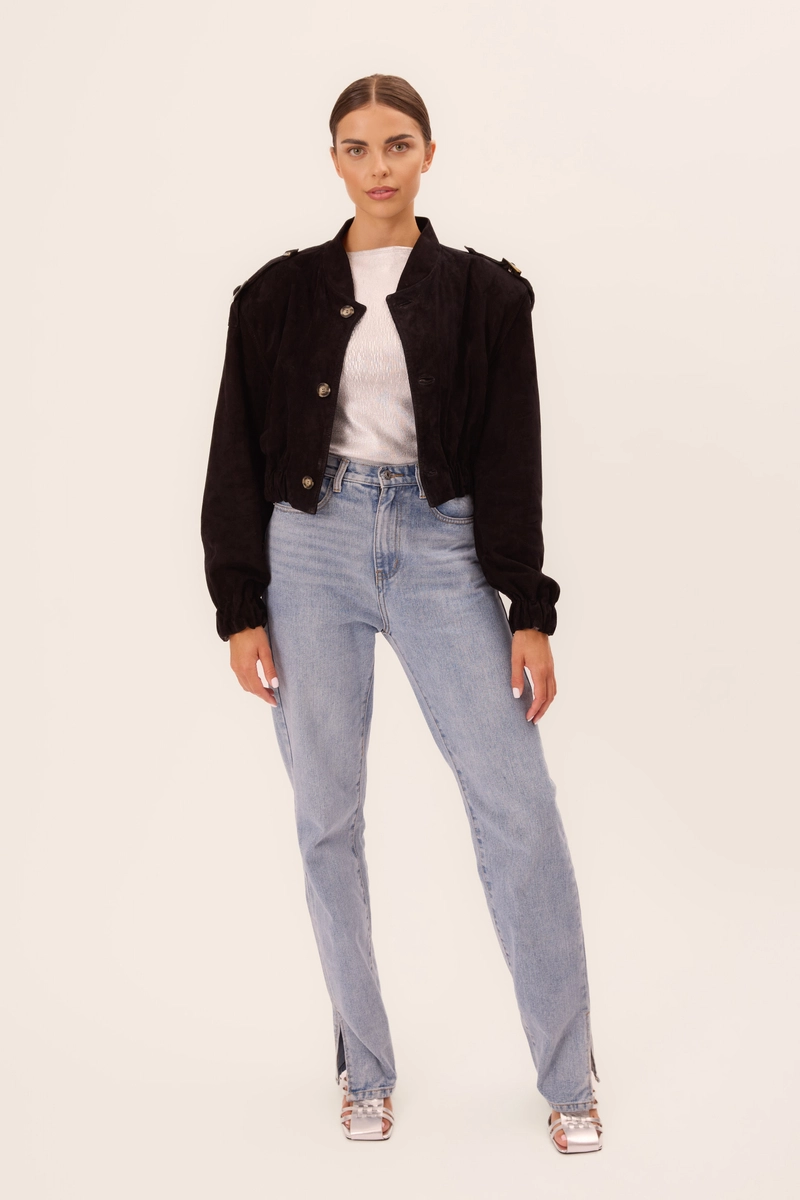 BLACK VELVET SHORT BOMBER JACKET WITH SHOULDER ELEMENTS