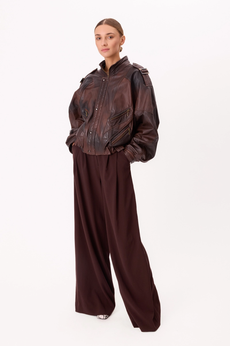 The brown VINNCI leather jacket is a second-hand design, restored and reworked with meticulous attention to detail. Crafted from genuine leather in a distressed brown shade, it retains its classic silhouette with a modern twist. The bomber cut, with a wide elastic waistband, wide shoulders, and epaulets, lends the piece a distinctive, contemporary feel, while the meticulous finishing and logo-embossed closures emphasize the craftsmanship. This unique piece combines the durability of leather with the ideal of conscious fashion.
