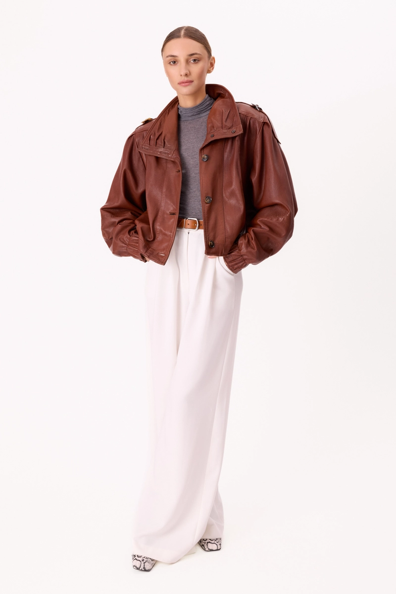 BROWN LEATHER BOMBER JACKET WITH HIGH COLLAR