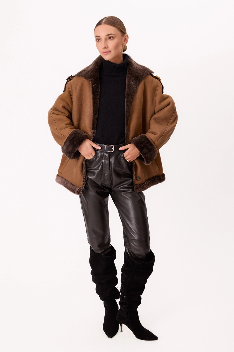 The brown VINNCI sheepskin coat is a second-hand design, refurbished and reworked with attention to every detail to ensure durability and elegance for seasons to come. The longer cut gives it a classic character, while the wide shoulders and meticulous finishing accentuate its timeless style. The logo button closure and natural leather texture combine functionality with craftsmanship. This versatile wardrobe staple perfectly reflects the spirit of conscious fashion.