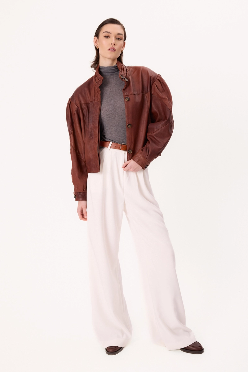 The brown VINNCI leather jacket is a revamped, second-hand gem – carefully reworked to delight with style for seasons to come. Classic and modern – the cropped design with five rows of adjustable elastic and boldly defined shoulders give it a distinctive look. The logo button closure and impeccable finish create a timeless, unique wardrobe staple.
