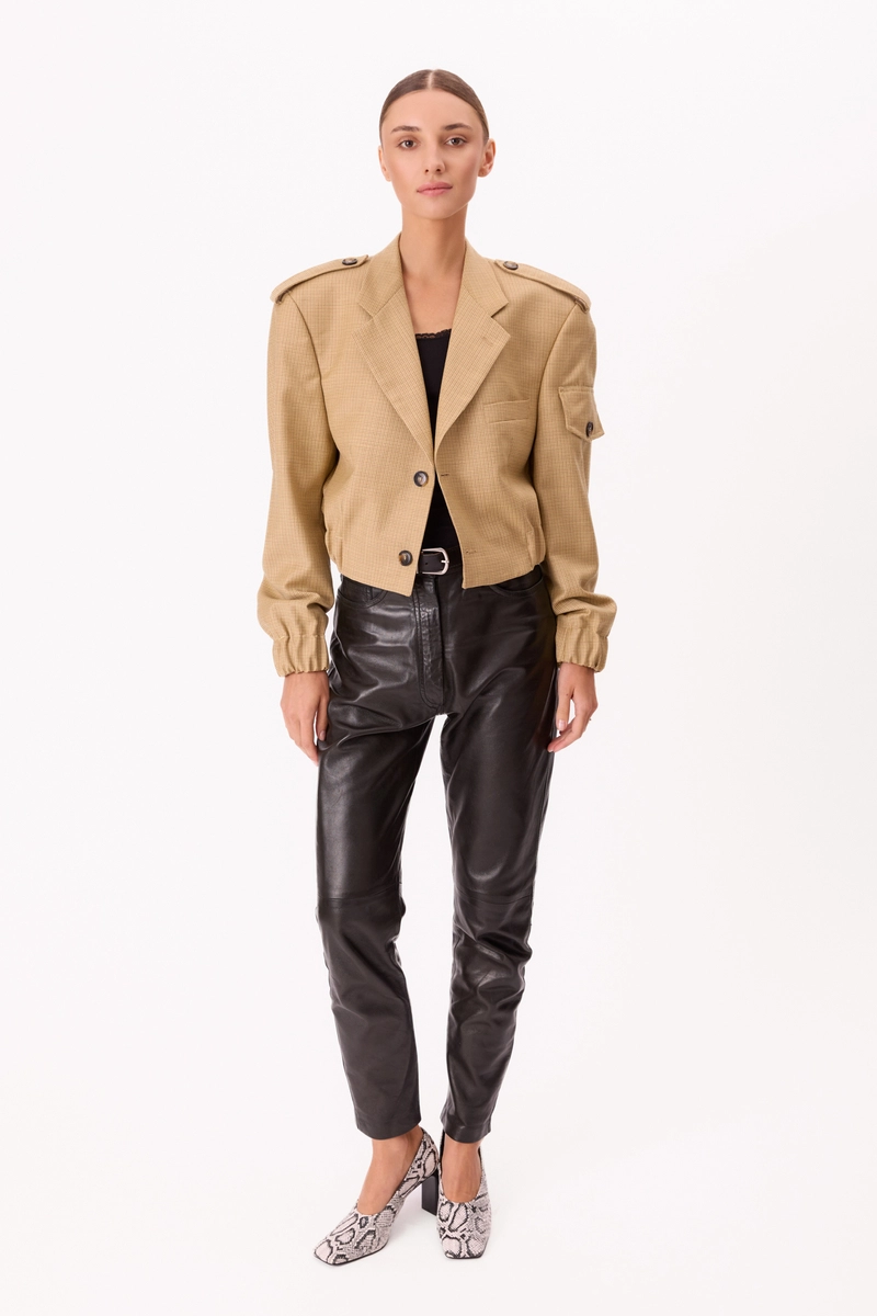 This yellow, short bomber jacket in a nativity scene shade is an upcycled design created from a men's blazer. Transformed and reworked with attention to every detail, it combines classic elegance with a modern character. The oversized cut, tapered sleeves and waistband finished with wide elastic bands, epaulets, and branded buttons give it a distinctive and timeless style. Unique and stylish – created with fashion-conscious women and a unique personality in mind.