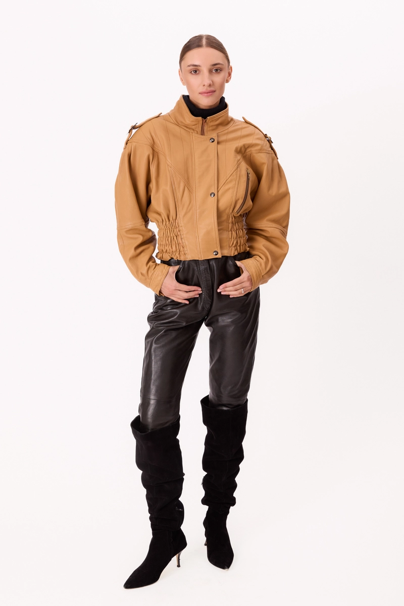 This caramel VINNCI leather jacket is a unique, second-hand item – carefully restored and reworked to give it a new character and extend its life. The oversized cut, combined with five rows of adjustable elastic at the waist and distinctly defined shoulders with epaulets, creates a design that combines elegance with modernity. The subtle texture of the leather highlights its uniqueness and artisanal character. This timeless piece perfectly reflects the idea of conscious fashion – stylish, durable, and unique.