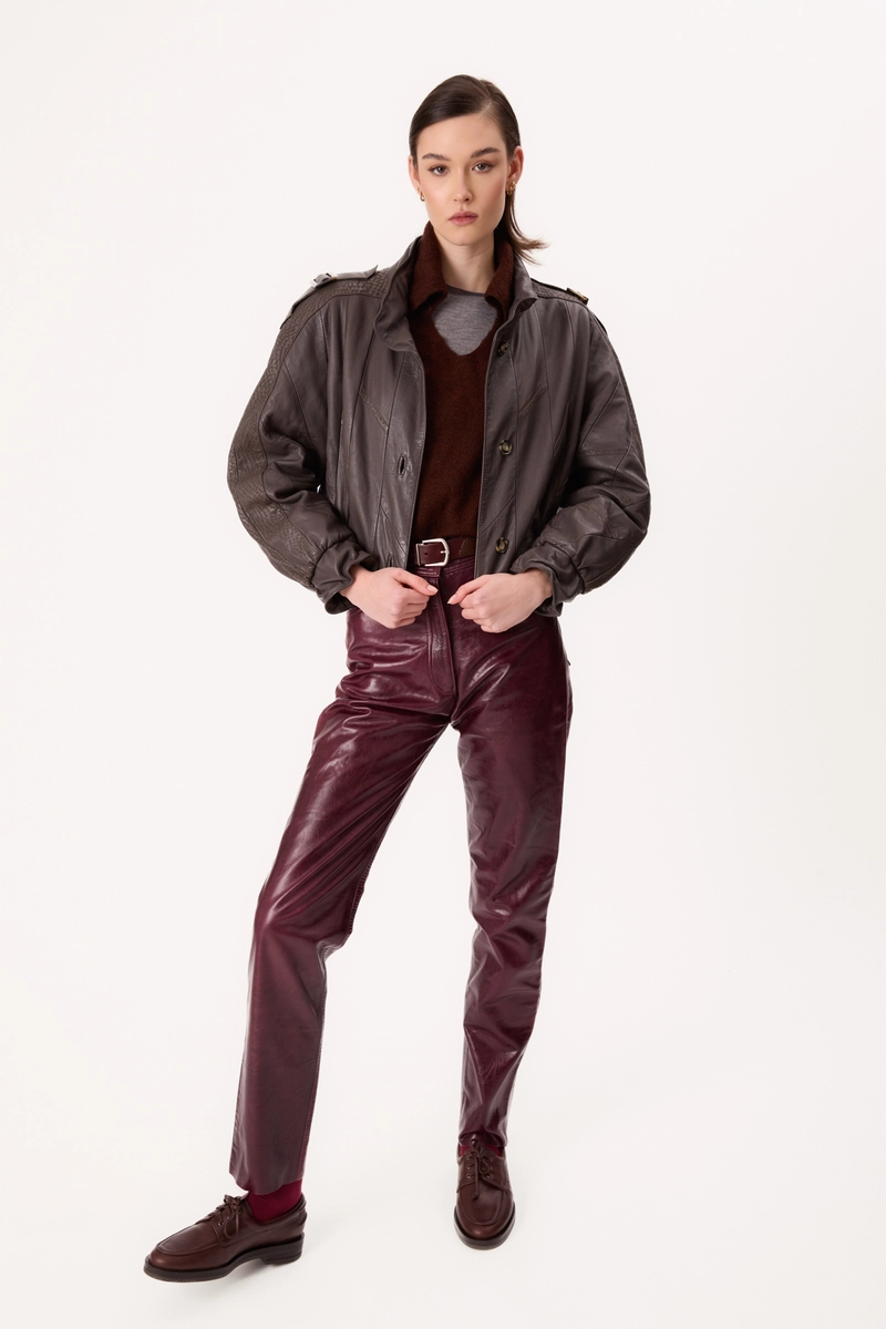 This gray VINNCI leather jacket is a unique, second-hand item – carefully restored and reworked to give it a new character and extend its life. The shorter cut, with a single, wide elastic waistband and distinctly defined shoulders with epaulets, combines elegance with modernity. The delicate, ornate pattern on sections of the jacket highlights its uniqueness and craftsmanship. This timeless piece perfectly reflects the idea of conscious fashion – stylish, durable, and unique.