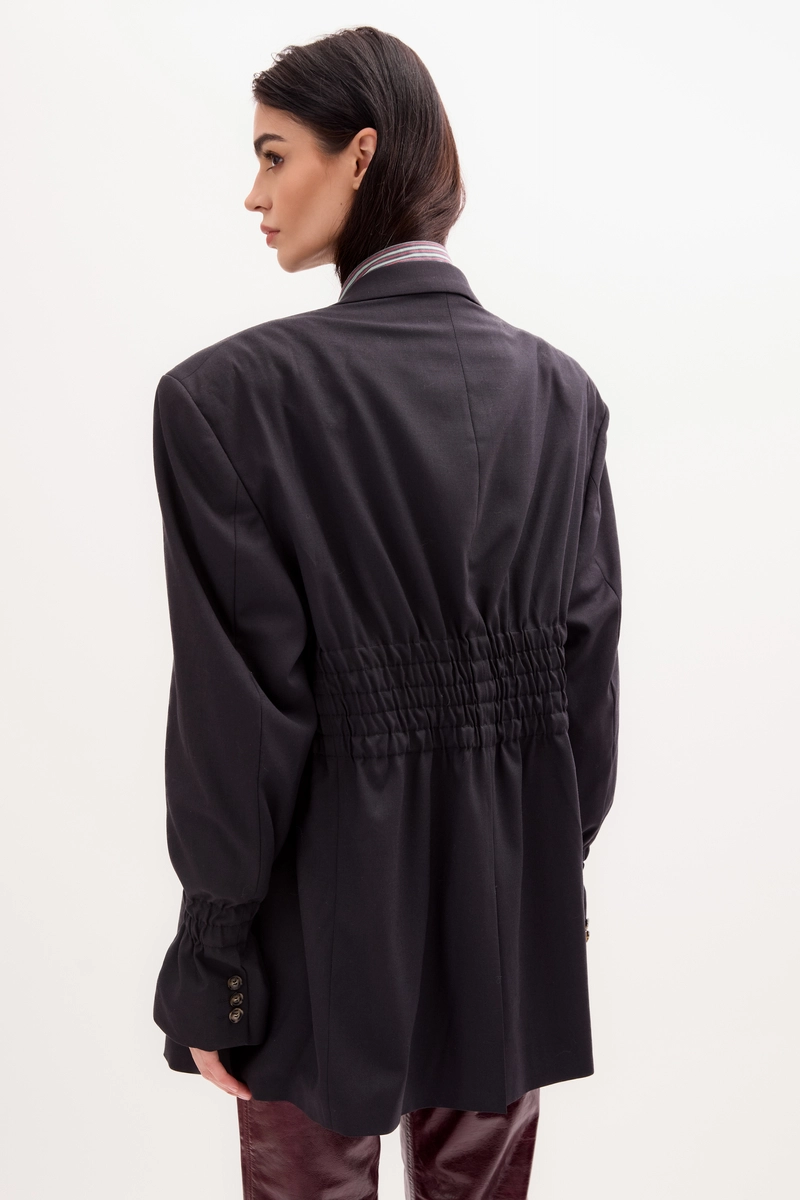 The classic graphite VINNCI blazer is an upcycled design created from a men's oversized blazer. Crafted from a vintage base, it's enhanced with five rows of adjustable elastic waistbands, allowing for a custom fit. Wide shoulders and branded buttons add a distinctive touch. Timeless and unique – created with style and fashion in mind.