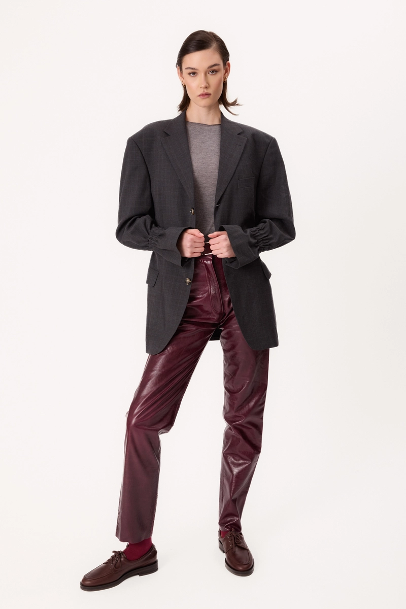 The classic graphite VINNCI blazer is an upcycled design created from a men's oversized blazer. Crafted from a vintage base, it's enhanced with five rows of adjustable elastic waistbands, allowing for a custom fit. Wide shoulders and branded buttons add a distinctive touch. Timeless and unique – created with style and fashion in mind.