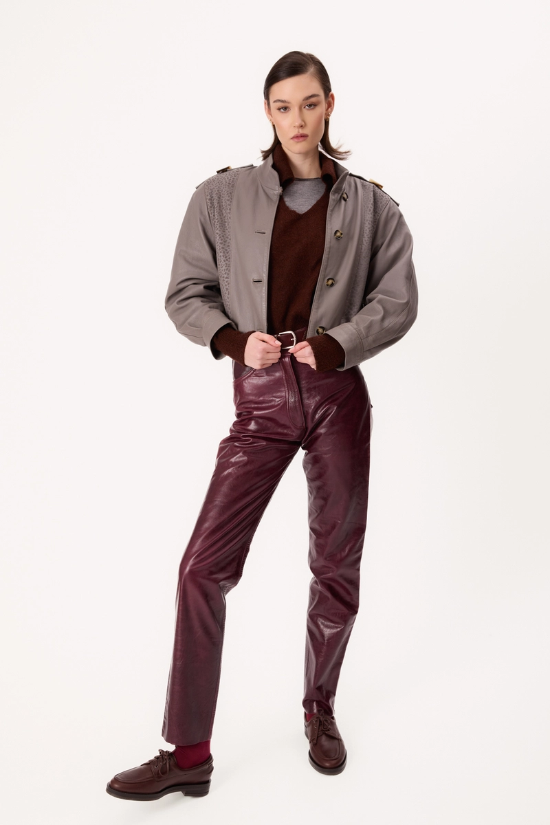This gray VINNCI leather jacket is a unique, second-hand item – carefully restored and reworked to give it a new character and extend its life. The shorter cut, with a single, wide elastic waistband and distinctly defined shoulders with epaulets, combines elegance with modernity. The delicate, ornate pattern on sections of the jacket highlights its uniqueness and craftsmanship. This timeless piece perfectly reflects the idea of conscious fashion – stylish, durable, and unique.