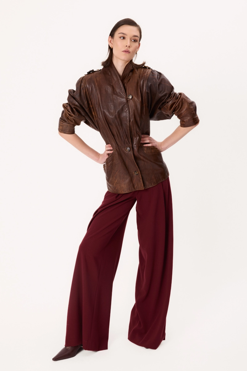 This brown VINNCI leather jacket is a second-hand design, restored and reworked with meticulous attention to detail. Crafted from genuine leather in a distressed brown shade, it retains its classic silhouette with a modern twist. The long, fitted cut with five rows of adjustable elastic accentuates the silhouette and ensures a comfortable fit. Wide shoulders and epaulets add a distinctive touch, while meticulous finishing and logo buttons emphasize the craftsmanship.
