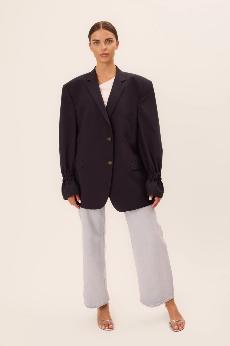 LONG PLAIN NAVY BLUE FITTED JACKET WITH ELASTIC SLEEVES