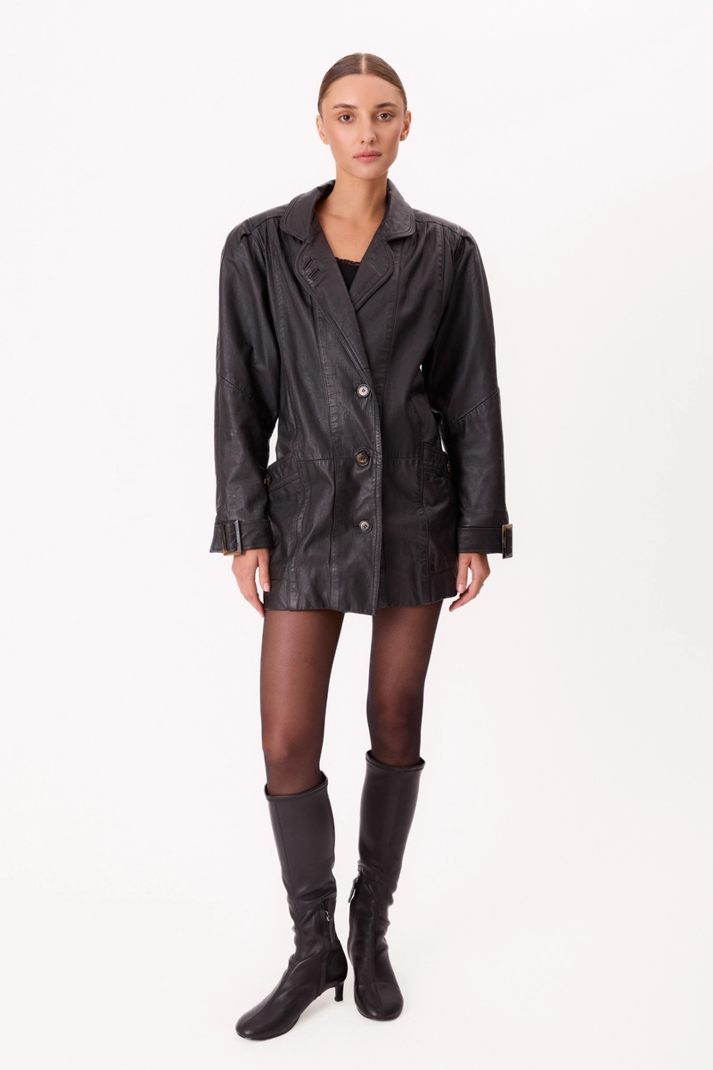 This black, long VINNCI leather jacket is a second-hand model, refurbished and reworked with attention to precision finishing. Wide shoulders and a fitted hem with five rows of elastic create a modern, balanced design. Logo button closure and sleeve buckles add functional details, emphasizing the design's solid craftsmanship and contemporary character.