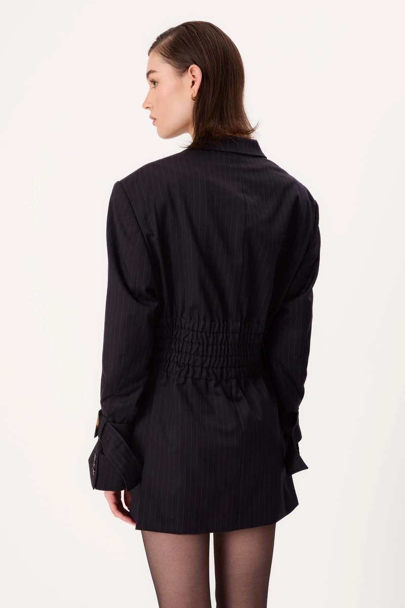 The navy blue VINNCI blazer with subtle stripes is an upcycled design created from a men's oversized blazer. The long cut with five rows of adjustable elastic at the waist allows for a tailored fit, accentuating the figure's proportions. Buckles on the sleeves and logo buttons give the piece a modern touch while maintaining classic elegance. Carefully updated and reworked, it combines timeless style with the idea of conscious fashion.
