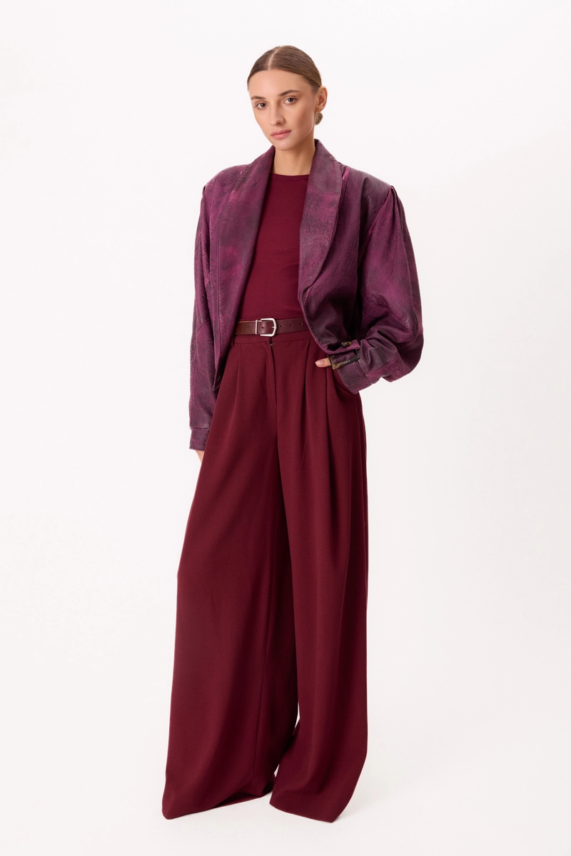 The pink, distressed VINNCI leather jacket is a unique second-hand model – restored and reworked with attention to every detail. A single, logo-printed button closure and a wide elastic waistband accentuate its distinctive cut, combining minimalist form with a modern touch. This unique, timeless piece is perfect for a conscious and individual style.