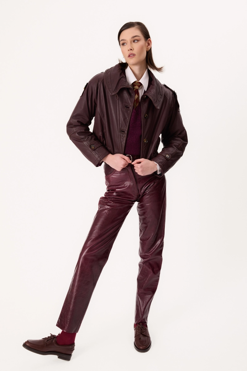 The plum cropped VINNCI leather jacket is a true second-hand gem — restored and reworked with great attention to detail to serve for many more seasons. Unique and stylish, it blends a classic silhouette with the modern character of a bomber jacket. The short cut with five adjustable elastic bands at the waist, broad shoulders, and shoulder epaulettes accentuates the figure and adds definition. Logo buttons and refined finishes complete the look, making it a timeless and distinctive wardrobe piece.