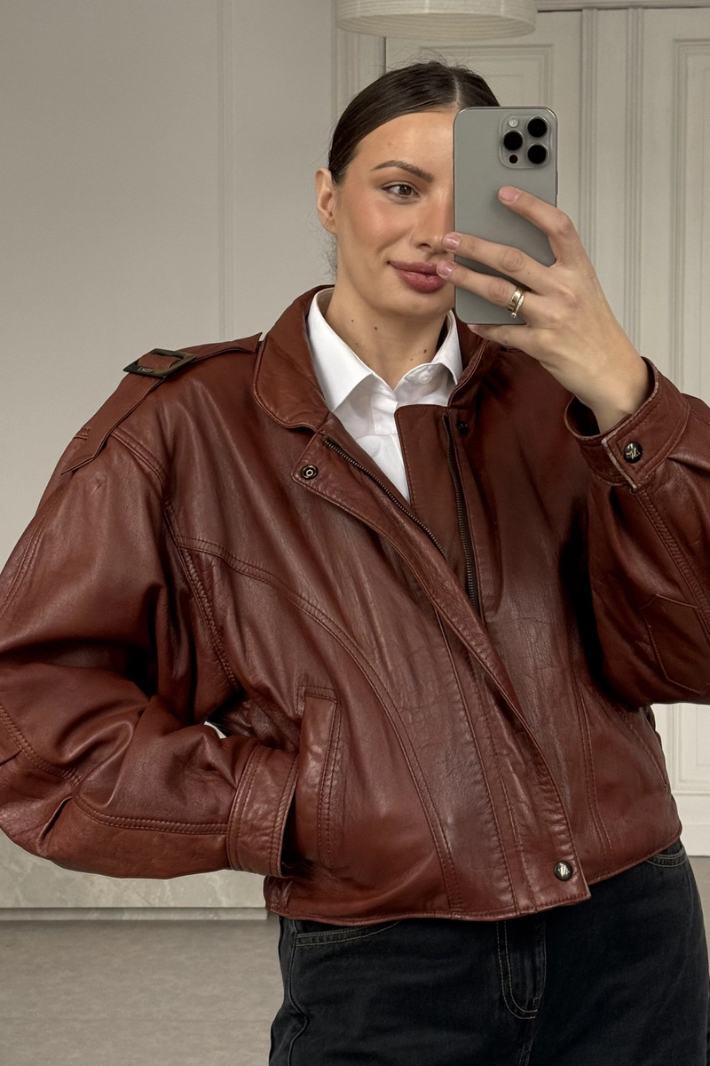 The red VINNCI leather jacket is a unique second-hand item – refurbished and reworked to combine a classic silhouette with a modern, distinctive cut. Crafted from reddish-brown leather, it features an oversized top, epaulets, and logo buttons for added character. An adjustable waist and cropped sleeves give the piece a contemporary silhouette, while decorative stitching finishes the design with craftsmanship. This is a unique, timeless wardrobe staple in the spirit of conscious fashion.