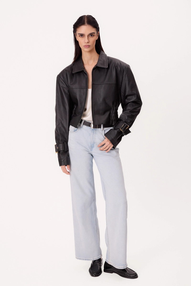 SHORT BLACK ADJUSTABLE WAIST REGULAR LEATHER JACKET WITH BUCKLES
