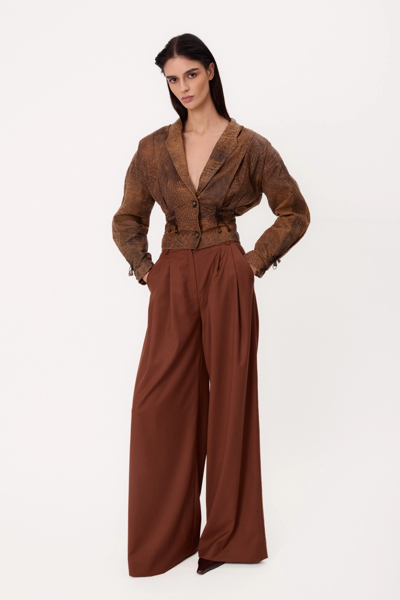 SHORT BROWN ADJUSTABLE WAIST EMBELLISHED PETITE LEATHER JACKET