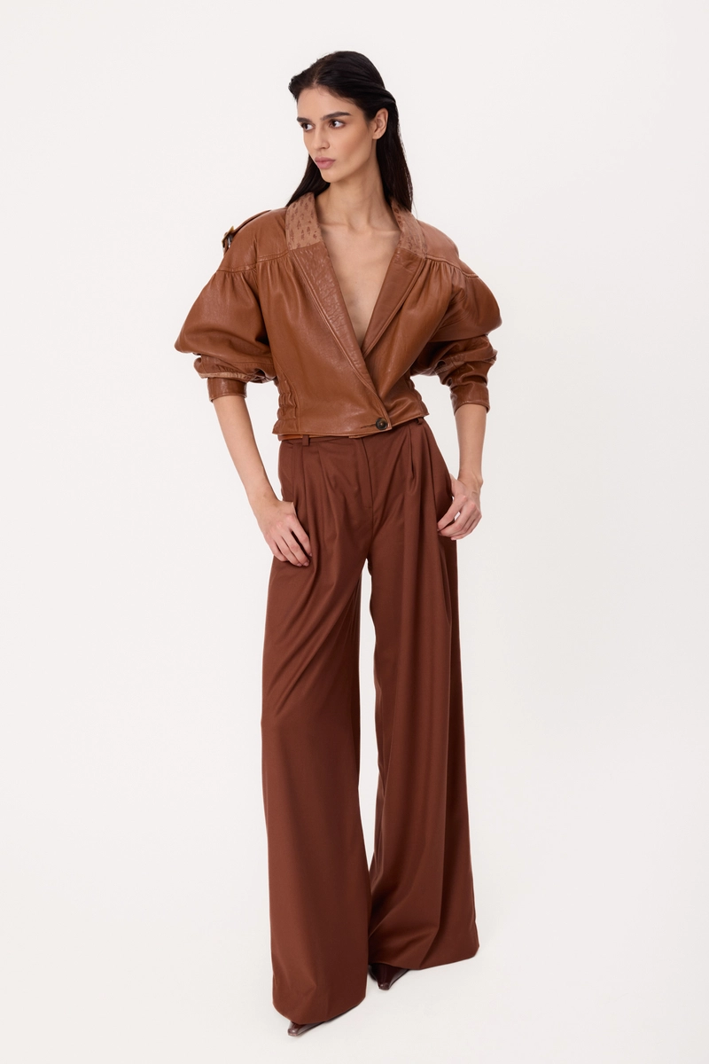 SHORT BROWN WAISTED PETITE BROWN LEATHER JACKET WITH DECORATIVE COLLAR