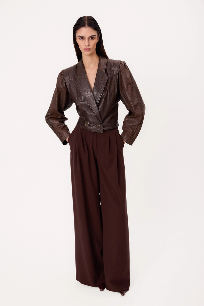 SHORT CHOCOLATE LEATHER ADJUSTABLE WAIST PETITE BIKER JACKET