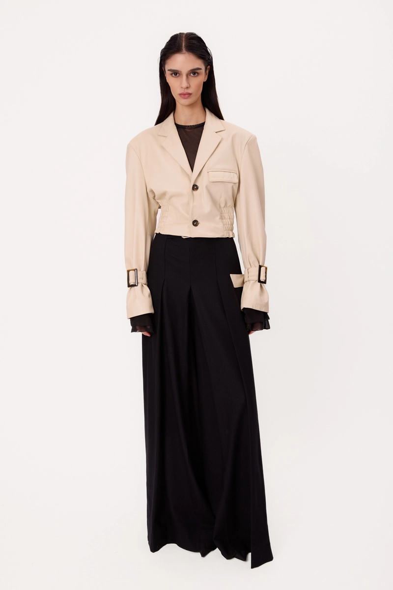 SHORT CREAM REGULAR LEATHER JACKET WITH ADJUSTABLE WAIST AND BUCKLES