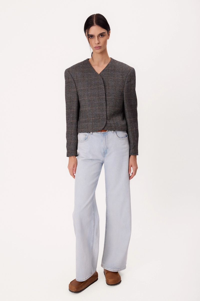 SHORT STRAIGHT GRAY PETITE BLAZER WITH BLUE CHECK MODEL No9