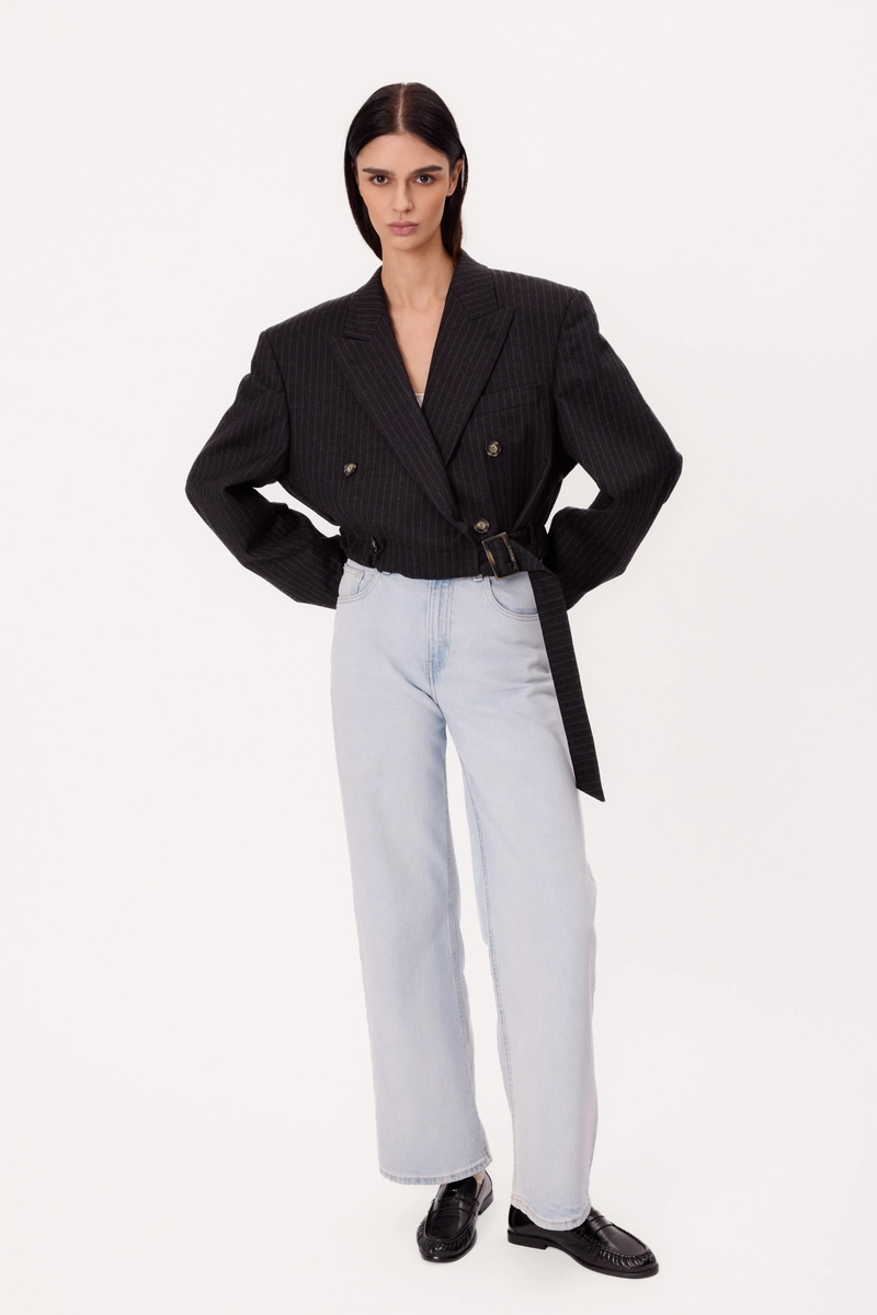 SHORT STRAIGHT NAVY BLUE TALL JACKET WITH LIGHT PINSTRIPE WITH BELT MODEL No3