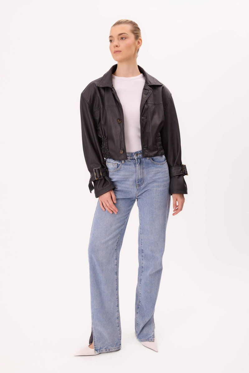 SHORT WAISTED BLACK LEATHER JACKET WITH BUCKLES