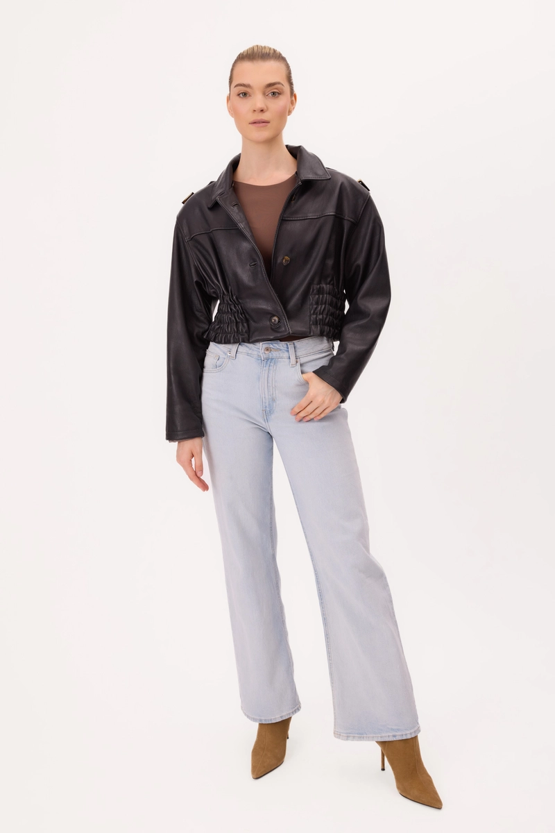 SHORT WAISTED BLACK LEATHER JACKET WITH EPADS