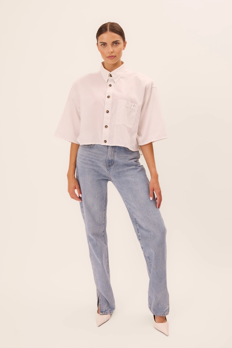 WHITE SHORT OVERSIZED SHIRT WITH A DELICATE CHECKERED PATTERN WITH WIDE DETACHABLE SHOULDER