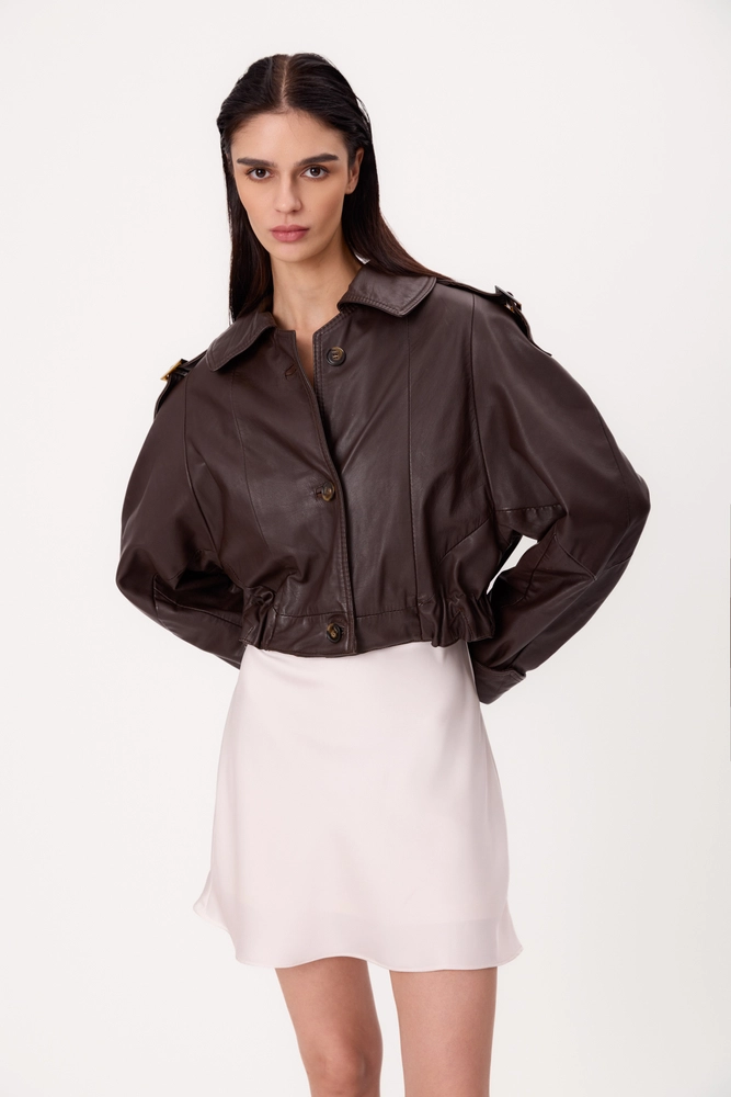 KRÓTKA RUDA KURTKA SKÓRZANA REGULAR Z PAGONAMI I KLAMRAMI NA RĘKAWACH