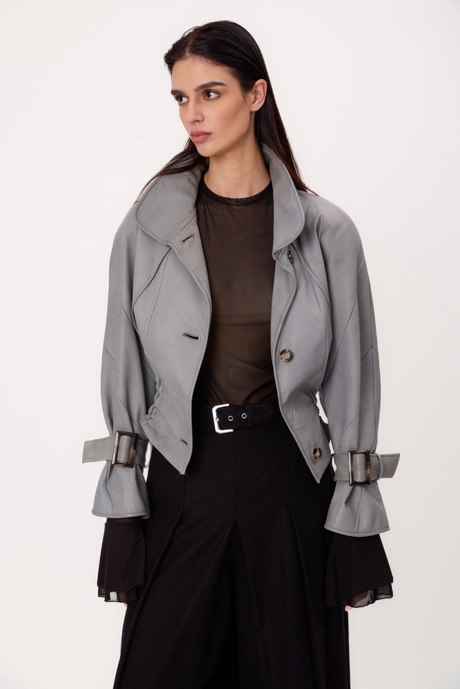 KRÓTKA BRĄZOWA REGULOWANA W TALII ZDOBIONA PRZECIERANA KURTKA SKÓRZANA PETITE