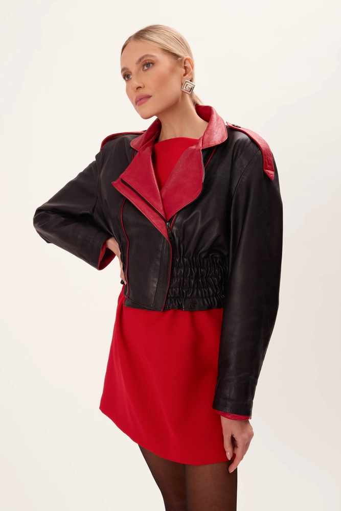 CZARNA TALIOWANA KURTKA SKÓRZANA Z CZERWONYMI WSTAWKAMI