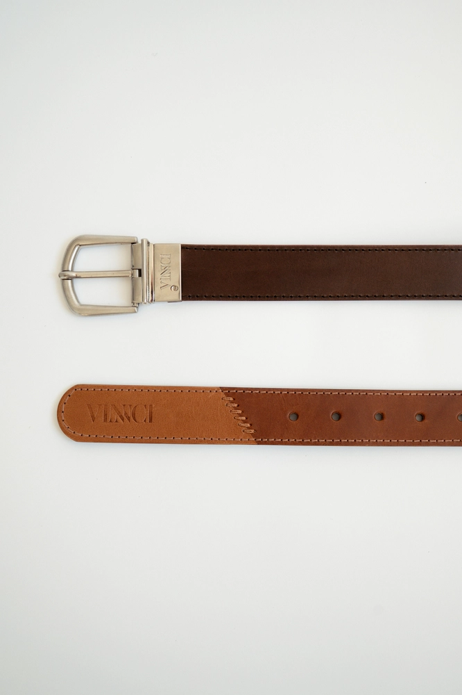 DWUSTRONNY SKÓRZANY PASEK Z OBROTOWĄ KLAMRĄ – PATCHWORKOWY RUDY-JASNOBRĄZOWY / CZEKOLADOWY-BURGUNDOWY