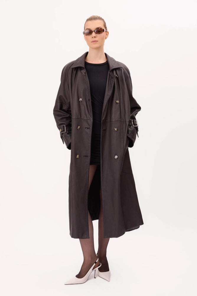 DŁUGI MAXI CZEKOLADOWY ZWĘŻANY W TALII PŁASZCZ Z KLAMRAMI NA RĘKAWACH