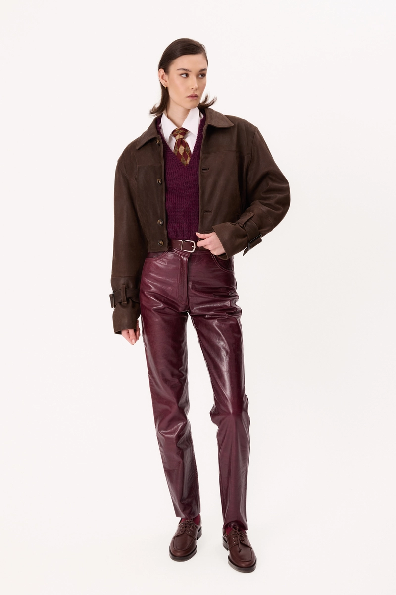 Czekoladowa zamszowa kurtka VINNCI to unikatowy projekt z drugiego obiegu – starannie odrestaurowany i przerobiony, by zyskał nowoczesny charakter przy zachowaniu klasycznej formy. Krótszy fason z trzema rzędami regulowanych gum subtelnie modeluje talię, a klamry w rękawach dodają całości charakteru i wyrazistości. Miękki, zamszowy odcień czekoladowej skóry oraz logowane guziki podkreślają rzemieślnicze wykończenie. To ponadczasowy model łączący elegancję, styl i ideę świadomej mody.