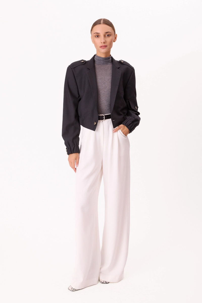 Czarna, krótka bomberka VINNCI to upcyclingowy projekt stworzony z męskiej marynarki. Przekształcona i przerobiona z dbałością o każdy detal, łączy klasyczną elegancję z nowoczesnym charakterem. Szeroka guma w talii i rękawach, szerokie ramiona, pagony oraz logowane guziki nadają jej wyrazistości i ponadczasowego stylu. Unikatowa i stylowa, stworzona z myślą o świadomej modzie i indywidualnym charakterze.