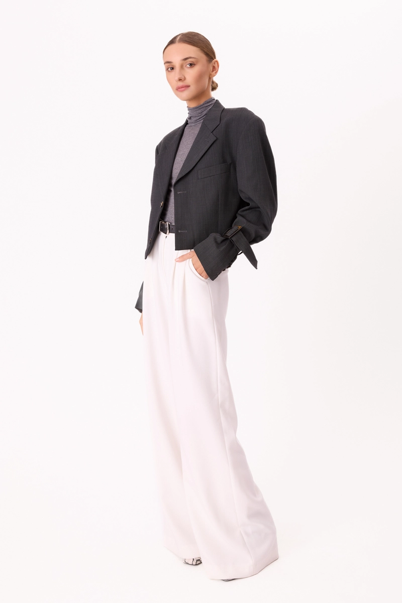 Ciemnoszara marynarka VINNCI w delikatną, jasną kratkę to upcyclingowy projekt powstały z męskiej marynarki i przekształcony w nowoczesny, krótszy fason. Zwężona w talii, z szerokimi ramionami, pięcioma rzędami regulowanych gum oraz klamrami w rękawach zyskuje wyrazisty, ale ponadczasowy charakter. Logowane guziki podkreślają staranne wykończenie, a całość łączy klasyczną elegancję z ideą świadomej mody.