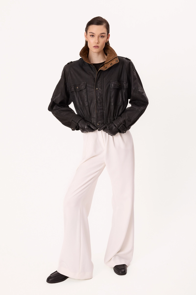Czarna skórzana kurtka VINNCI z brązowym, wysokim kołnierzem to wyjątkowy egzemplarz z drugiego obiegu – starannie odnowiony i przerobiony, by zyskać nowe życie. Krótszy, dopasowany fason z szeroką gumą w talii oraz pagonami łączy klasyczną formę z nowoczesnym charakterem. Zapięcie na zamek i logowane zatrzaski podkreślają rzemieślniczą precyzję wykonania. To unikatowy, ponadczasowy element garderoby stworzony z myślą o stylu, jakości i świadomej modzie.